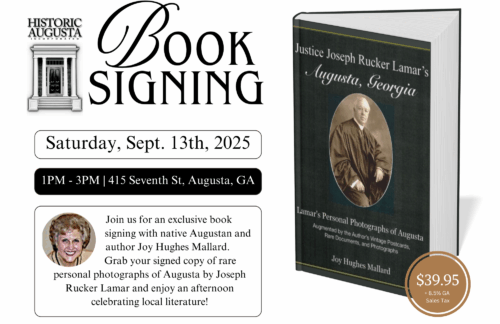 AUGUSTA, GA — Historic Augusta, Inc. invites the public to a special book signing event on Saturday, September 13, 2025, from 1:00 PM to 3:00 PM, at the Boyhood Home of Joseph Rucker Lamar, located at 415 Seventh Street, Augusta, GA.