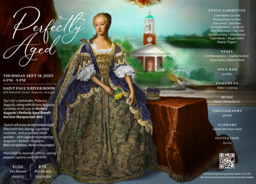Our City’s namesake, Princess Augusta, along with Historic Augusta, cordially invite you to Perfectly Aged, Historic Augusta’s Benefit Auction at Saint Paul’s River Room on Thursday, September 18th from 6:00 pm-9:00 pm .  Our largest fundraiser of the year returns to Saint Paul’s River Room as we celebrate 60 years of Historic Augusta! Enjoy an delicious libations by Joe Willis’ Bar Service, music by Thomas Barnes, and edible delights from Walker’s Catering.